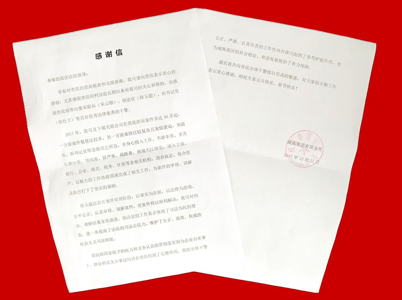 近日,威高集团致信我院,对初村人民法庭干警的公正司法、认真敬业表示感谢。信中写到:“贵院将国家赋予的权利和义务认真的贯彻落实到为企业办实事上,群众利益无小事这句话在贵院得到了完整体现。”